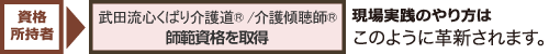 「武田流心くばり介護道®」師範を取得することによって、「介護福祉士」は介護される側の身体的・精神的援助においてツボを押さえたより満足感の深いサービスが出来るようになります。また、家族への心の配慮がこれまで以上に密に行き届くようになり、結果として介護負担の軽減が図られ、最後に「看てもらってよかった!」「最後まで看てよかった!」と思っていただける心を実感できるようになります。自身も仕事に対する満足感が高まることによってよりよいサービス提供への意欲が旺盛になります。
